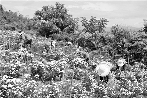 初秋时节,永善县溪洛渡街道新拉村科农种植合作社基地里,白菊竞相绽放,20余名基地工人满脸喜悦地穿梭在菊花丛中,采摘菊花。据笔者了解,科农种植合作社每年发放务工工资40余万元,让当地群众在家门口实现挣钱、顾家两不误。 通讯员 陈 洪 许晓瑞 摄