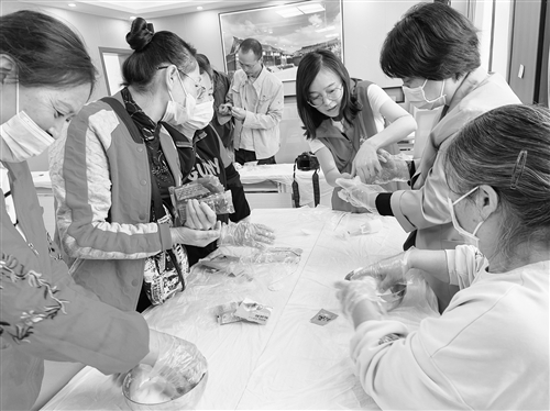 大家边看教程制作月饼,与周边伙伴互相交流,边动手制作冰皮月饼,音乐声、交谈声、欢笑声交织在一起,其乐融融。 通讯员 陈 静 摄